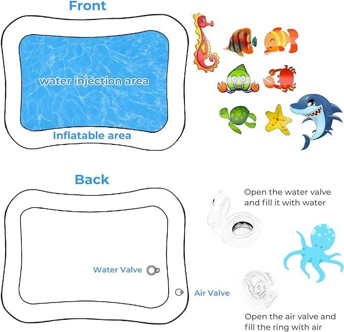Introduce your little one to a world of wonder and essential development with the Baby Water Tummy Time Mat. This innovative and engaging inflatable mat provides a safe, stimulating, and mess-free way for infants to enjoy tummy time. Filled with adorable floating marine creatures, it captivates babies' attention, encouraging them to reach, push, and play. It's the perfect tool for fostering motor skills, sensory exploration, and cognitive development while providing endless entertainment. A must-have for modern parents prioritizing early learning and joyful play!